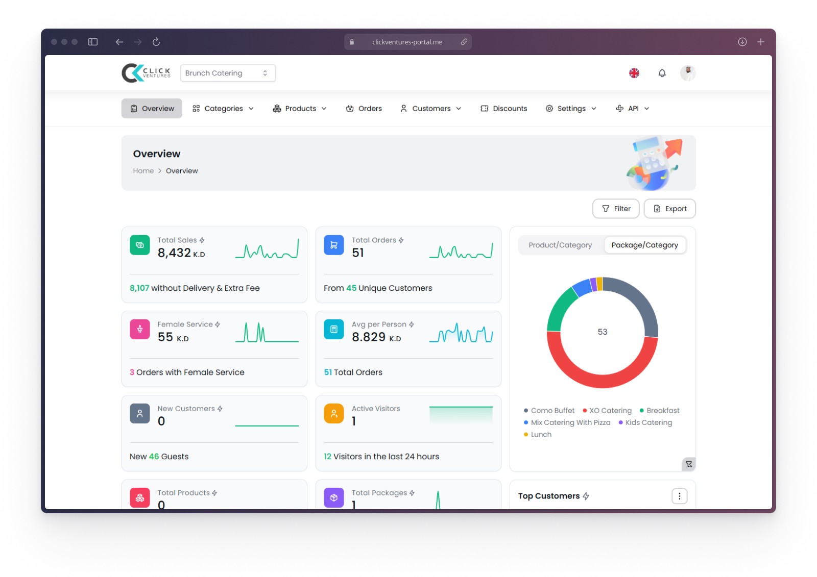 The ClickVentures Portal is an all-in-one admin dashboard designed to streamline operations and empower businesses. With features like detailed reports, dynamic charts, order and customer management and more.